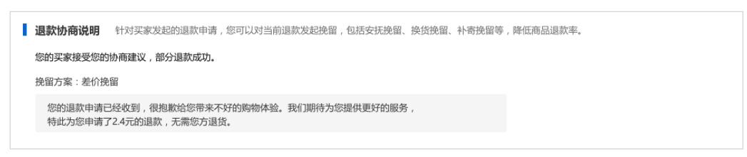 一. 寫在最前面,你真的在賺錢嘛?流量的成本越來(lái)越高,買家要求越來(lái)越高,在這個存量經營時代,爲什麽賣了很多貨,卻沒有賺很多?答案就(jiù)在退款裡,每一筆退款帶來(lái)的隐形成本太高。一筆退款的顯性成本=銷售額的損失隐形成本=退換貨的快遞費+售後客服的工資+商品的咨詢+客戶流失......銷售額的增長确實很重要,但(dàn)是【退款】已經逐漸成爲越來(lái)越多商家所關注的指标,在此背景下,商家退款協商工具應運而生。爲商家提供平台化、數據化、線索可(kě)追蹤化的退款協商産品及退款解決方案,這是我們一直所探索的事(shì)情。本操作指南(nán),即是幫助大家解讀(dú)退款協商産品體(tǐ)系,以及如(rú)何利用這些功能幫助商家進行更高質量的店鋪運營。 二. 産品怎麽開通,在哪裡能夠找到目前該産品隻針對實力商家開通,而且完全免費,沒有開通的商家,不要着急哦!(會陸續開放(fàng)更多的商家和功能,敬請(qǐng)期待!)有一天,當你焦躁的處理退款單時,發現退款單神奇的出現如(rú)下闆塊:親,您的退款單可(kě)以協商挽回了,開不開心!!! 三. 商家退款協商操作流程1.打開賣家後台左側點擊【交易】————【退貨退款管理】2.選擇退款類型選擇【售中】,【僅退款(已發貨)】或者【退貨退款(已發貨)】的退款單小二提示:隻有已發貨,且是售中訂單才可(kě)以協商挽回!(未發貨退款買家要退就(jiù)退吧(ba),攔又攔不住)3.點擊退款單若退款單中出現了【退款協商說(shuō)明】闆塊,這筆退款就(jiù)可(kě)以被協商挽回了。目前我們支持2種協商挽回方式:安撫挽回,差價挽回(換貨挽回,補寄挽回等正在全力開發中)4.選擇合适的挽回方式以安慰挽留舉例,可(kě)在挽留文案處編輯你的挽留留言(不超過50字)如(rú):【物流原因】親,這個訂單我們看物流已經在配送途中了,我們幫您催一下快遞小哥,親能體(tǐ)諒下不退款嗎(ma)?如(rú):【買家主觀原因】親,這款産品是我們店鋪的鎮店之寶呢(ne),您可(kě)以試試看哦!後面有問(wèn)題都(dōu)可(kě)以聯系我解決滴。5.點擊提交挽留,再次點擊确認6.遞交挽留後,耐心等待買家的反饋提示:退款協商挽回一旦提交,我們商家就(jiù)無法修改挽回方案,但(dàn)是您還(hái)可(kě)以正常處理退款。 7.買家端反饋7.1 如(rú)買家接受了您的退款協商方案退款單會自動關閉,走正常的交易超時機制。7.2 如(rú)買家拒絕了您的退款協商方案退款協商方案關閉,請(qǐng)您正常處理退款單。8. 差價挽回操作流程1.選擇【差價挽留策略】————【填寫金額】————【提交挽留】2.等待買家響應處理3.1:如(rú)買家接受,部分(fēn)退款成功,退款單完結,該筆訂單無法再次發起退款。3.2:如(rú)買家拒絕,退款協商失敗,請(qǐng)正常處理退款單。 四.【商家必備】如(rú)何利用好退款協商工具當買家因爲物流,配送等問(wèn)題發起退款,可(kě)以考慮使用【安撫協商】編輯好合适的文案,挽回客戶據調研,50%以上因爲物流原因發起的退款,是可(kě)以通過商家的安撫來(lái)進行挽救的收到貨後,買家因爲商品小瑕疵或者包裝破損,想要發起退貨時,建議(yì)嘗試使用【差價挽留】進行挽回有的商家習慣通過支付寶、第三方紅(hóng)包的形式給買家返差價,但(dàn)這樣産生糾紛時,我們是沒有任何線上的線索可(kě)追溯的。通過挽留工具,産生糾紛時,可(kě)以直接在後台看到和買家的協商記錄了!不需要反複舉證,耗時耗力。 五.常見(jiàn)問(wèn)題答疑Q: 産品是免費的嘛?A:重要的事(shì)情說(shuō)3遍,産品完全免費!免費!免費!Q:什麽時候開放(fàng)退款協商工具A:預計(jì)本周内開放(fàng),敬請(qǐng)期待!Q:是所有訂單都(dōu)可(kě)以協商挽回嘛?A:考慮到用戶體(tǐ)驗,我們會在售中已經發貨的訂單開放(fàng)協商挽回入口。Q:我不是實力商家,我能使用嘛?A:請(qǐng)您耐心等待,會陸續開放(fàng)更多的商家和協商挽回方案的。