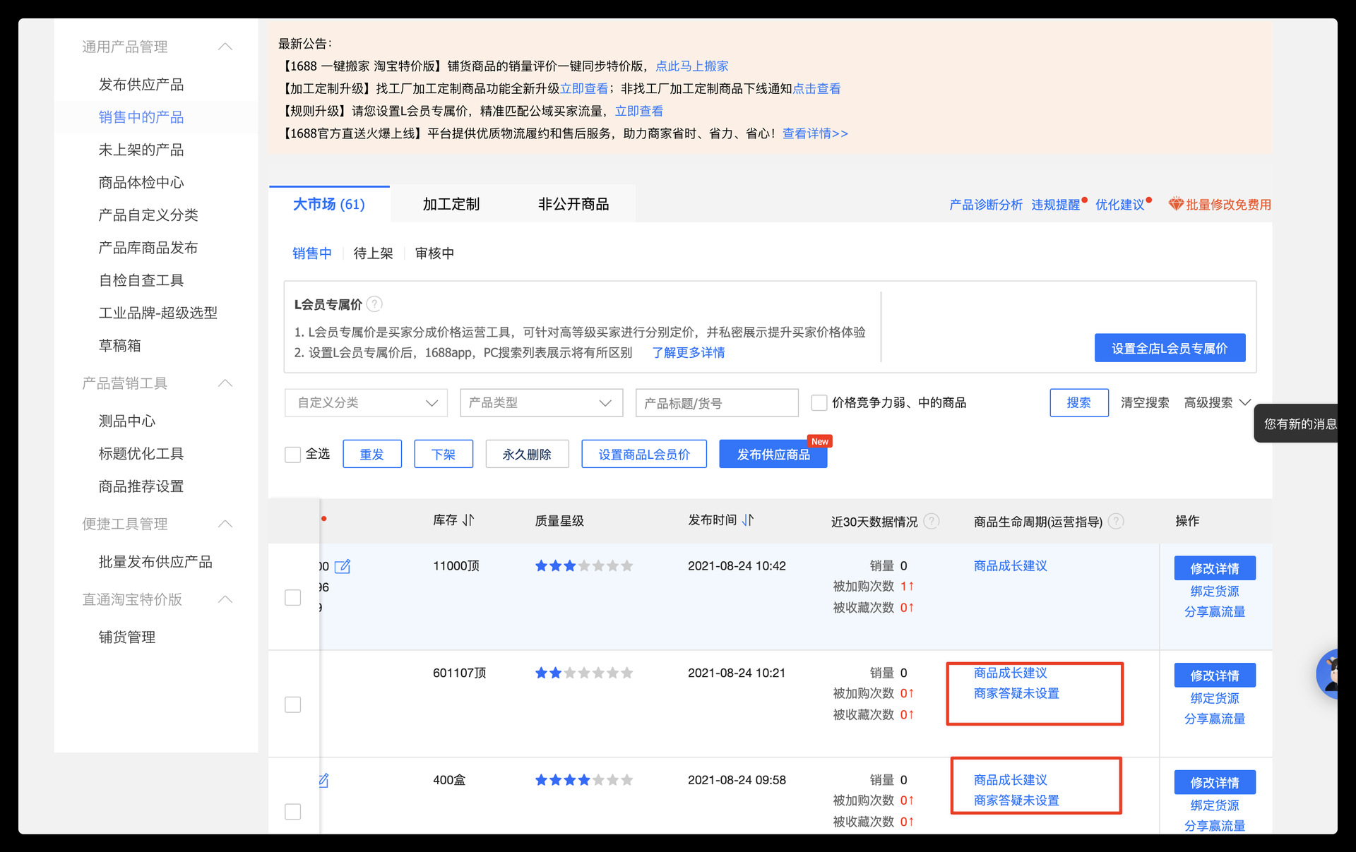 商品發布後,也可(kě)以在賣家工作台-商品-銷售中的産品進行商家答疑設置。
