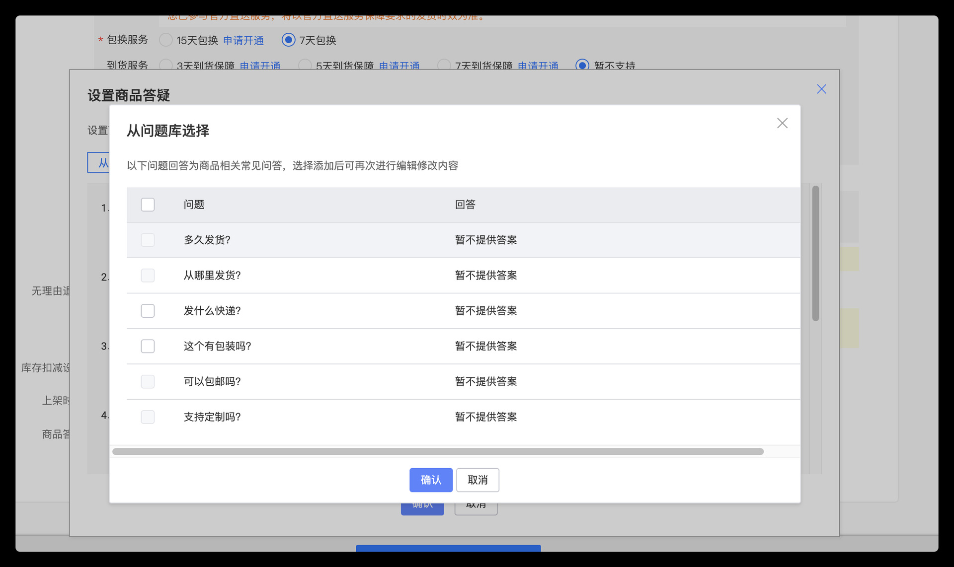 答疑如(rú)果沒設置也可(kě)直接在管理側點擊“商家答疑未設置”按鈕進行設置,設置流程和彈窗(chuāng)與發布商品處一樣。