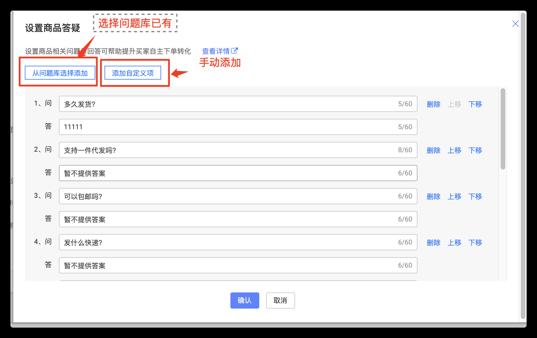 設置完畢後,點擊确認鍵,彈窗(chuāng)關閉,繼續走商品發布流程。問(wèn)答通過審核後會出現在商品詳情頁,見(jiàn)上文圖片示例。