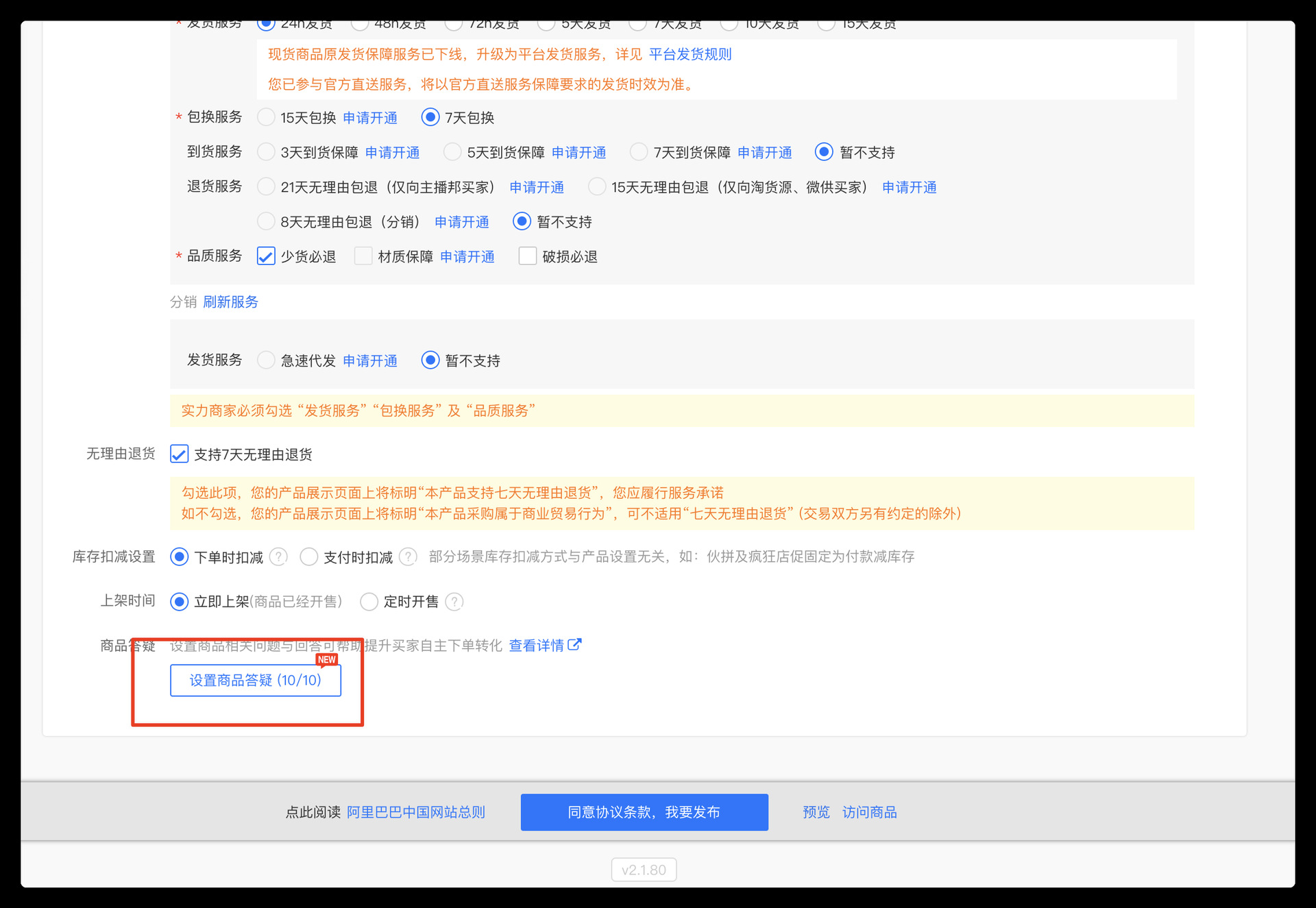 商品發布頁面,增加“商品答疑”闆塊,可(kě)點擊“設置商品答疑”進入設置頁面(不設置商品答疑也可(kě)以正常發布商品)