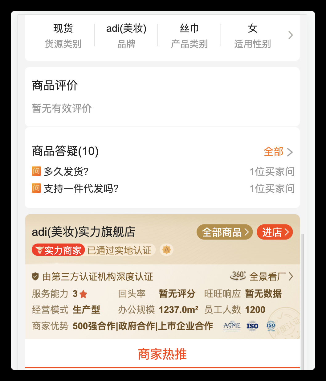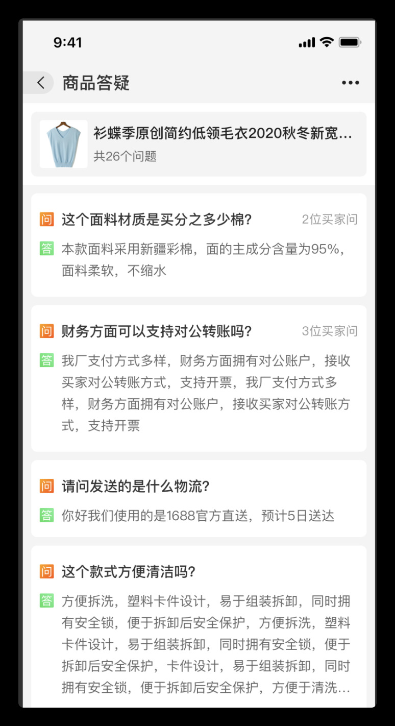各位商家朋友大家好,爲提高買家找貨效率,1688平台在8月26日(rì)上線商家答疑功能,各位商家朋友可(kě)以針對商品配置常見(jiàn)問(wèn)題問(wèn)答,讓買家加速對産品、服務以及店鋪的了解,從而提高買家找貨的效率,以及精準獲取買家,展現形式如(rú)下圖所示: