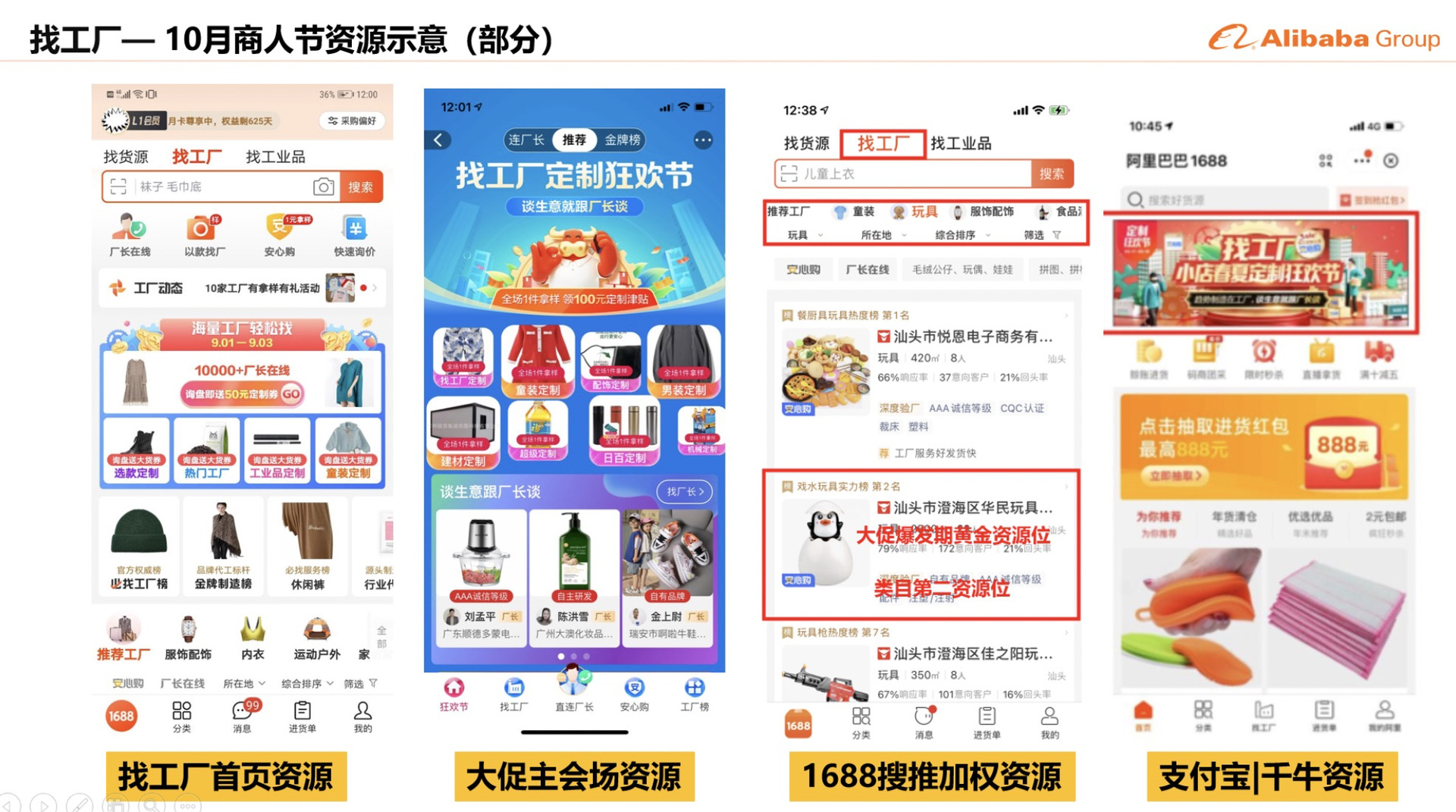 一、找工廠(chǎng)閃電拿樣新玩法10月商人節我們推出閃電拿樣新玩法,目标通過線上規劃化用戶運營,利用折扣樣品的的玩法,幫助工廠(chǎng)在大促期間獲取定制類買家(超200萬定制買家等你來(lái)),1個拿樣行爲,代表1個潛在定制生意,全面奠定年底旺季的生意基礎。二、找工廠(chǎng)10月大促營銷玩法主打閃電拿樣玩法,詢盤有禮爲基礎玩法,其中閃電拿樣限制商家門(mén)檻,詢盤有禮參與不限制商家門(mén)檻。三、找工廠(chǎng)10月商人節報名要求及入口專場類型:找工廠(chǎng)大促主會場報名要求:A.報名商家限僅限已經入駐找工廠(chǎng)(超級工廠(chǎng)、實力商家)和找工廠(chǎng)牌級工廠(chǎng)、安心購(gòu)工廠(chǎng)、标杆工廠(chǎng),同時報名需支持詢盤有禮玩法活動期間買家詢盤時,則獲得(de)1張該店鋪的合約交易券,券面額爲滿100-10元。B.報名1個新版定制品且支持選款定制(需上傳規格圖片),定制金冠品、鎮店之寶優先;該商品支持1元、9.9元、19.9元、5折拿樣(活動價爲發布定制品價5折),包郵(偏遠(yuǎn)地區除外),單用戶限購(gòu)2件(jiàn),專場限購(gòu)10件(jiàn),單品報名庫存大于50。【1元拿樣】報名入口:https://act.1688.com/home/calendarSelect.htm?tid=39260【9.9元拿樣】報名入口:https://act.1688.com/home/calendarSelect.htm?tid=39261【19.9拿樣】報名入口:https://act.1688.com/home/calendarSelect.htm?tid=39262【5折拿樣】報名入口:https://act.1688.com/home/calendarSelect.htm?tid=39259專場類型:找工廠(chǎng)大促外圍專場報名要求:商家必須入駐找工廠(chǎng)且爲定制工廠(chǎng)類型,同時報名需支持詢盤有禮玩法活動期間買家詢盤時,則獲得(de)1張該店鋪的合約交易券,券面額爲滿100-10元。報名入口:https://act.1688.com/home/topicDetail.htm?tid=39231四、閃電拿樣玩法和大促資源說(shuō)明1、商人節大促主會場、找工廠(chǎng)主會場、行業會場,定制賽道流量主推閃電拿樣報名商品;2、找工廠(chǎng)場景裡面,工廠(chǎng)名片、定制品詳情頁等資源将重點突出閃電拿樣;3、支付寶大促資源、夥拼頻道頁等站内外資源聯動,主推閃電拿樣;五、關于本次大促報名你可(kě)能疑惑的問(wèn)題?答:内圍專場僅限已經入駐找工廠(chǎng)(超級工廠(chǎng)、實力商家)和找工廠(chǎng)牌級工廠(chǎng)、安心購(gòu)工廠(chǎng)、标杆工廠(chǎng)報名,同時針對内圍商家來(lái)說(shuō),隻需報名内圍專場即可(kě)。答:不能,定制合約券隻能用于合約下單使用,僅限定制品。不與商人節期間店鋪其他(tā)任何優惠疊加,且不可(kě)使用在報名閃電拿樣的商品上。答:可(kě)以,使用不同定制品報名即可(kě);答:閃電拿樣4個專場,必須使用支持選款定制的定制品報名。