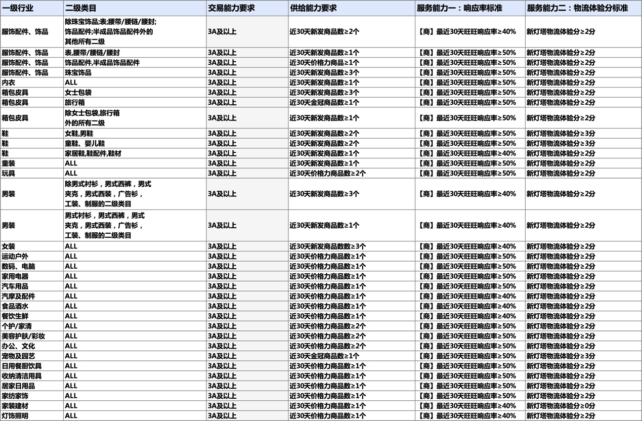 适用于1688消費品行業的所有誠信通會員、實力商家和超級工廠(chǎng),包含以下一級類目:女(nǚ)裝 / 男裝 / 内衣 / 童裝 / 鞋 / 箱包皮具 / 服飾配件(jiàn)、飾品 / 運動戶外 / 玩具 / 母嬰用品 / 日(rì)用百貨 / 數碼、電腦 / 家用電器 / 汽車用品 / 食品酒水 / 餐飲生鮮 / 美容護膚 / 彩妝 / 個護 / 家清 / 汽摩及配件(jiàn) / 辦公、文化 / 工藝品、禮品 / 寵物及園藝 / 家紡家飾 / 家裝建材 / 燈飾照(zhào)明。